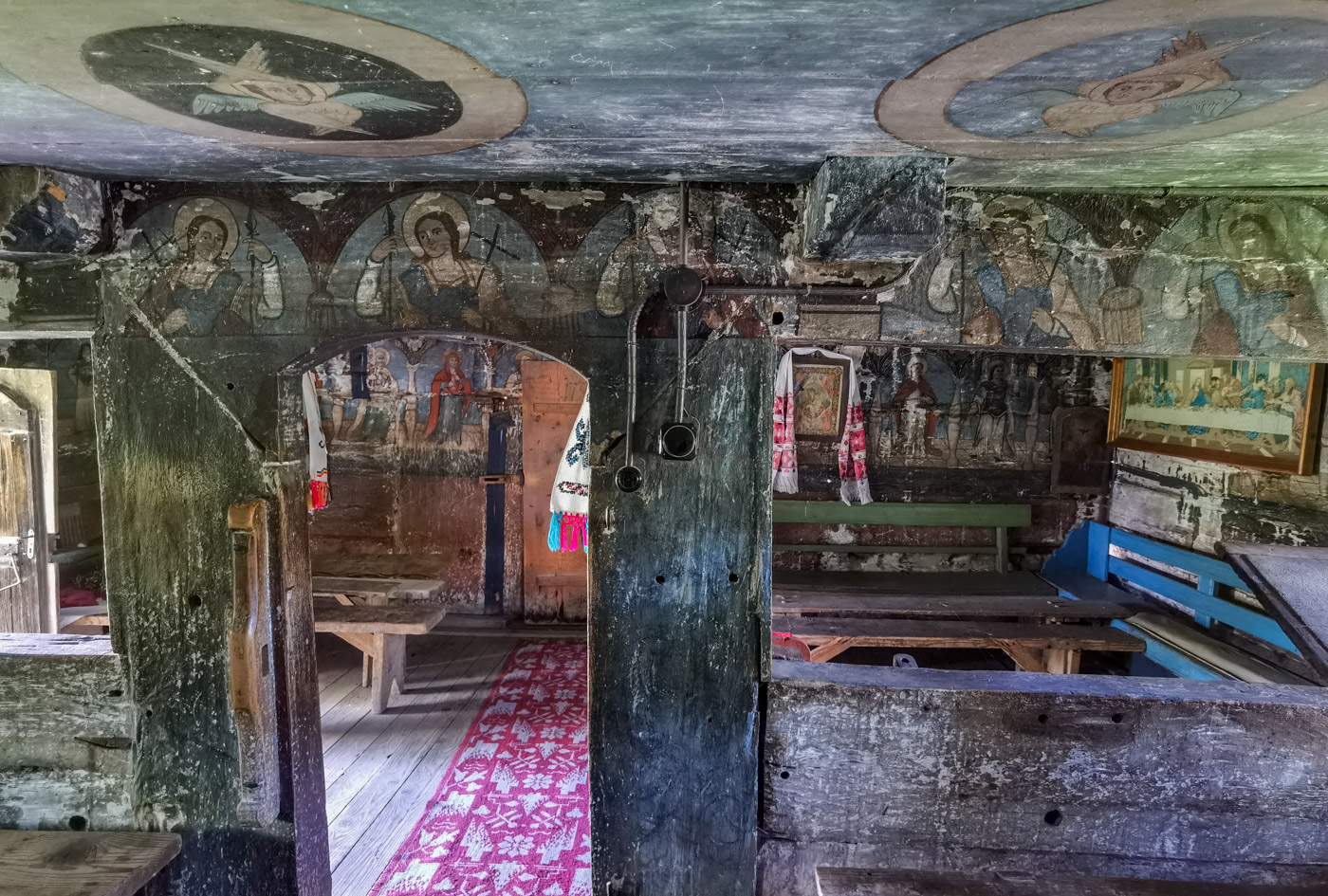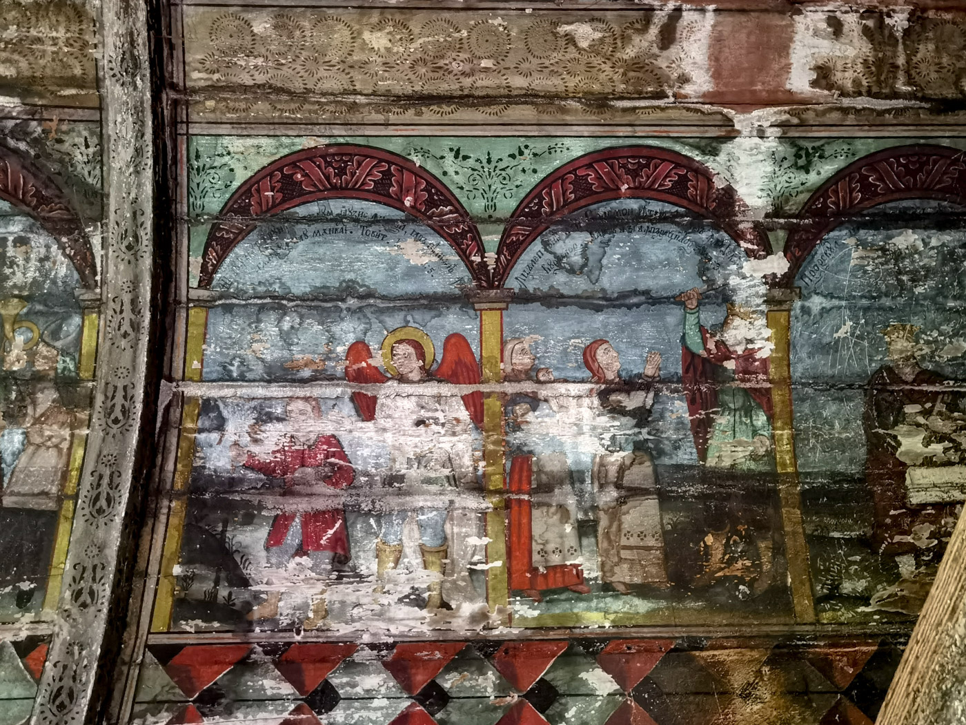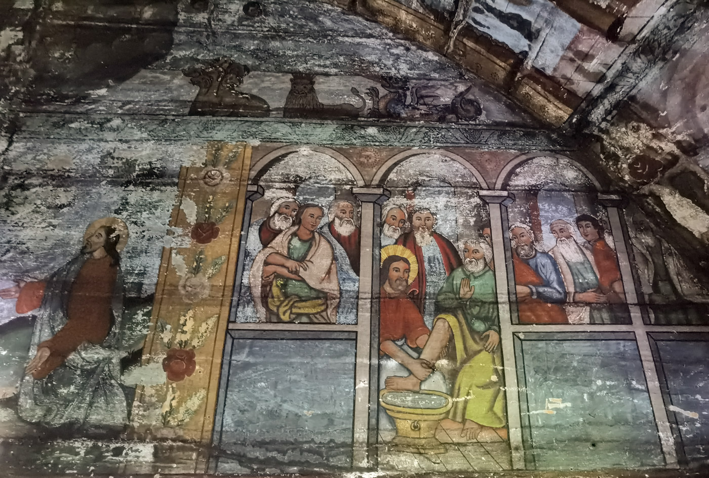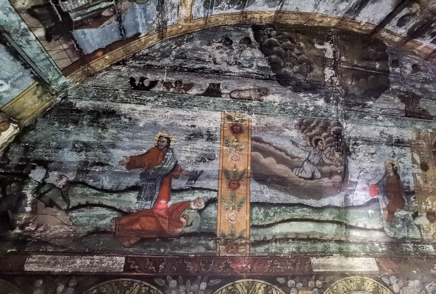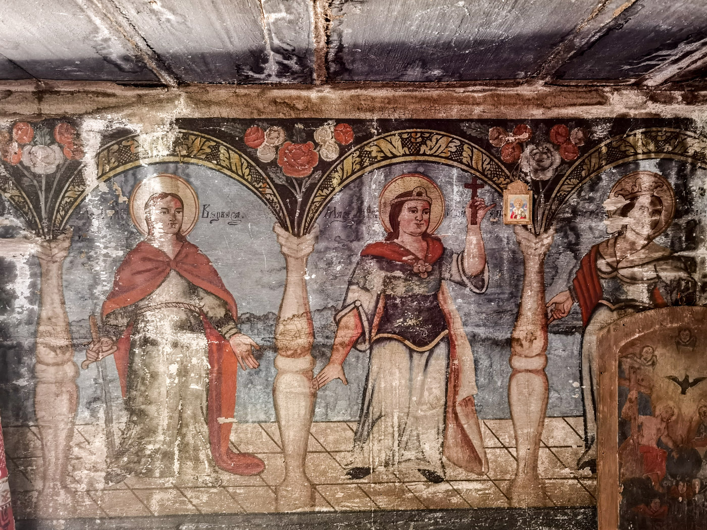 În naos, pe balustrada corului, sunt pictate minunile Mântuitorului, și sus, pe peretele de apus, căderea lui Adam și a Evei.