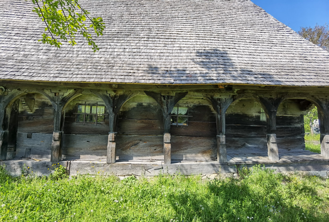Arcadele ce se sprijină pe stâlpi ciopliți sunt realizate din umerași în care au fost săpate motive geometrice, dar și rodul viței de vie, umerași ce se înfrățesc în jurul stâlpului, printr-o rozetă. Cuie de lemn cu capetele în formă de floare întregesc frumusețea prispei.