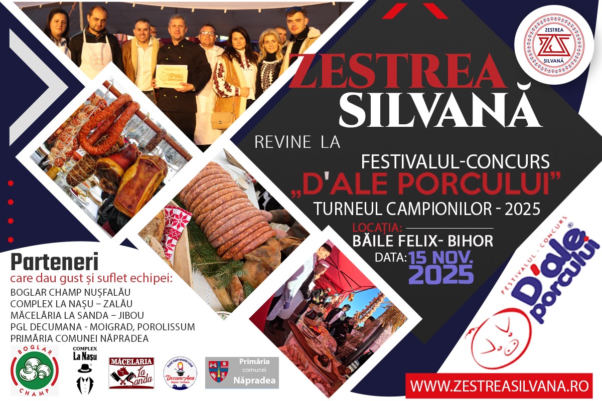 După performanța de excepție din 2024, când a urcat pe podiumul Festivalului Internațional „D’ale porcului”, echipa Asociației Zestrea Silvană se pregătește să revină la Oradea, între 15–16 noiembrie 2025, pentru o nouă ediție a celui mai important eveniment dedicat gastronomiei tradiționale românești – „Turneul Campionilor”.